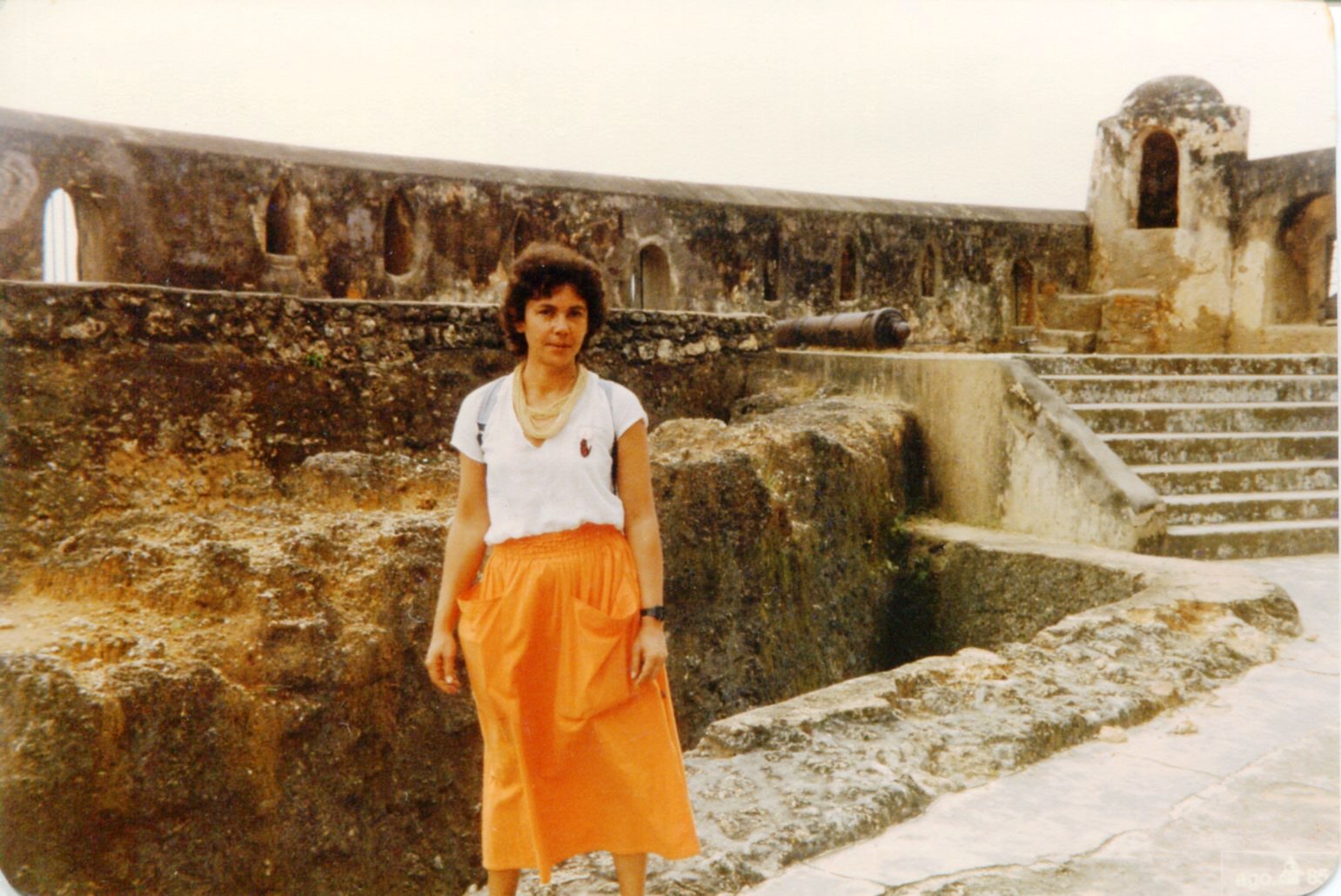 Fúlvia Rosemberg em passeio diante um antigo Forte