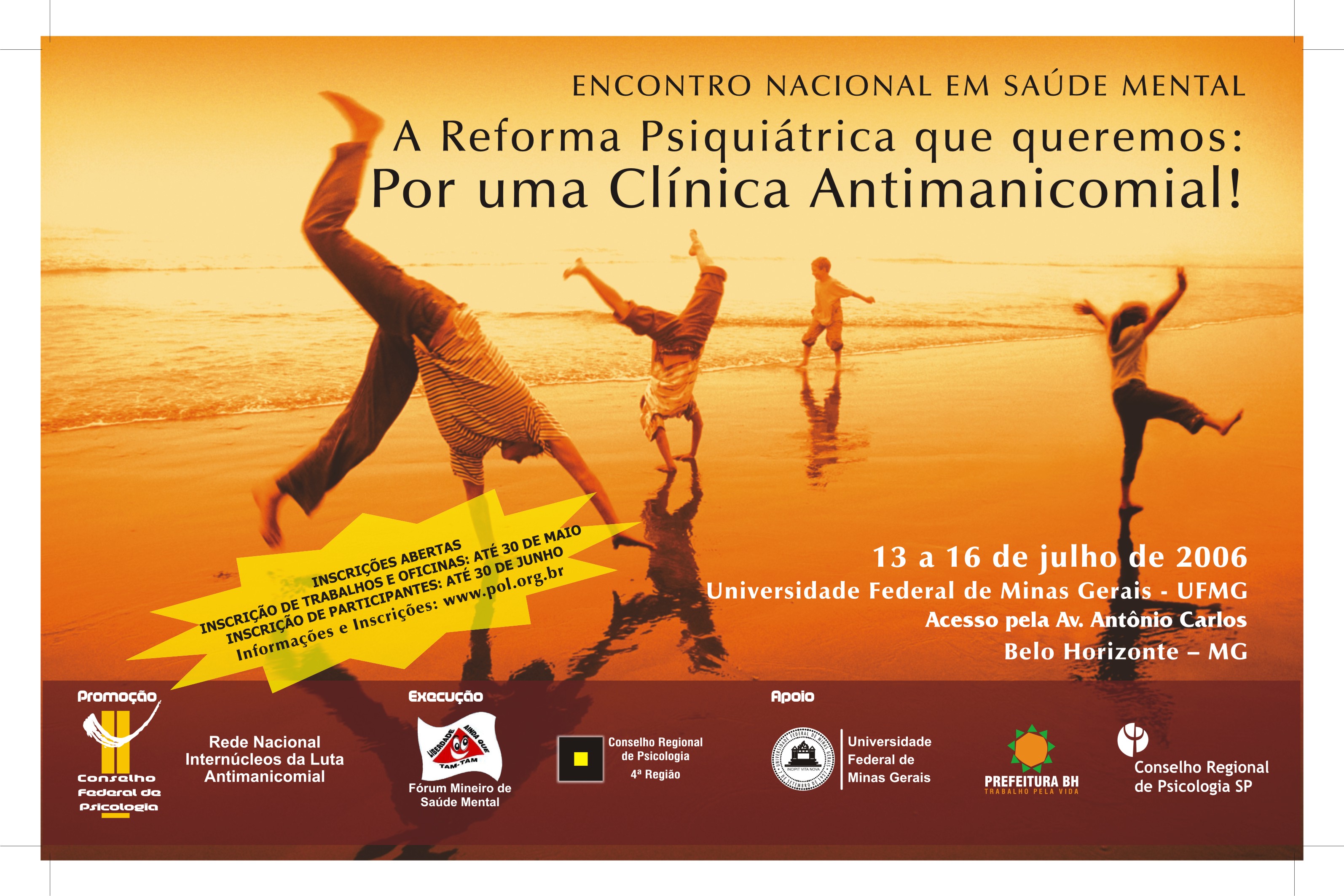 Do dia 13 a 16 de julho, em Belo Horizonte, acontecerá o Encontro Nacional de Saúde Mental "A Reforma Psiquiátrica que queremos: por uma clínica antimanicomial!". A proposta do evento é discutir temas e conceitos indispensáveis à "clínica antimanicomial"; os serviços substitutivos ao hospital psiquiátrico, onde esta clínica deve operar; as políticas públicas que devem assegurar o acesso aos serviços substitutivos; e o trabalhador como protagonista desta clínica.