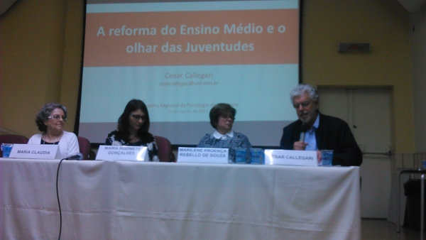 O anúncio da realização de uma reforma do Ensino Médio, com características de urgência através de Medida Provisória, foi disparador da promoção de um debate sobre a forma de estruturação desta modalidade de escolarização. Faz-se de fundamental importância uma discussão acerca da oferta desta modalidade de ensino e sobre o processo de escolarização destes sujeitos, sendo que o CRP SP tem papel fundamental na garantia de espaços para realização destes debates com os profissionais da psicologia e com a sociedade. Palestrantes: Cesar Callegari, Maria Claudia de Almeida Viana Junqueira, Marilene Proença Rebello de Souza. / Mediação: Maria Rozineti Gonçalves
