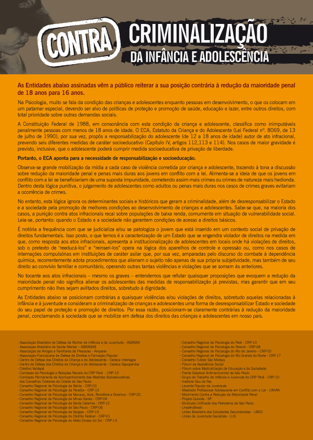 As Entidades abaixo assinadas vêm a público reiterar a sua posição contrária à redução da maioridade penal de 18 anos para 16 anos.