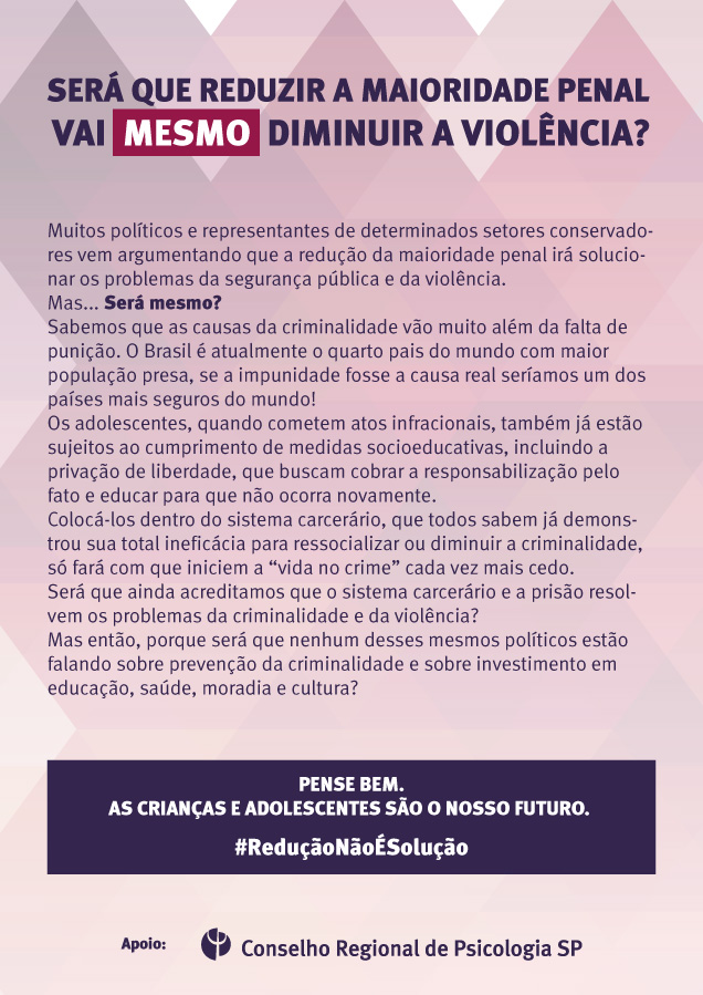 Material Promocional - Folheto - SERÁ QUE REDUZIR A MAIORIDADE PENAL VAI MESMO DIMINUIR A VIOLÊNCIA?