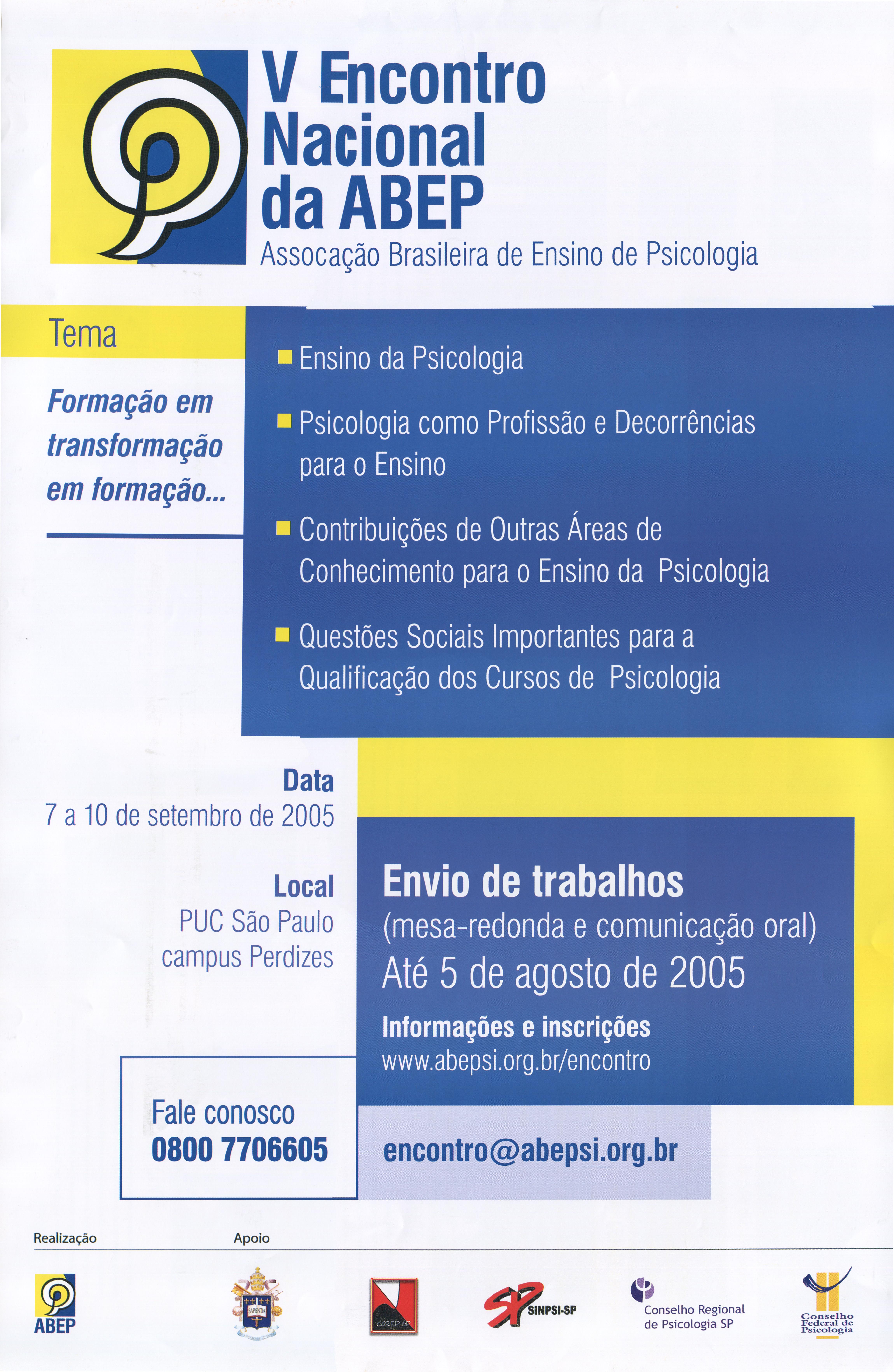 A ABEP vêm convidar a todos os preocupados e envolvidos com o Ensino da Psicologia, em todos os seus níveis, para participarem do seu V ENCONTRO NACIONAL DA ABEP, que será realizado nos dias 7, 8, 9 e 10 de setembro de 2005 na PUC em São Paulo, cujo objetivo é enfatizar o desenvolvimento do ensino da psicologia, coordenando informações e coligindo dados sobre o mercado de trabalho, sobre experiências educacionais de formação em Psicologia, sobre aplicações do conhecimento da psicologia que possam auxiliar na solução de problemas nacionais e outras informações necessárias e importantes para a qualificação dos cursos de Psicologia.